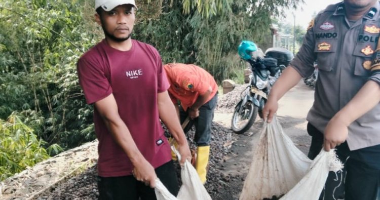 Bhabinkamtibmas Polsek Warungkondang Polres Cianjur, Aipda Dendi Ernando, melaksanakan kegiatan gotong royong bersama warga dan perangkat Desa Bunikasih, Kecamatan Warungkondang, Kabupaten Cianjur, Minggu (19/4/2026). Kegiatan tersebut berlangsung di Kampung Sarampo RT 002 RW 006 Desa Bunikasih sebagai bentuk sinergi antara Polri dan masyarakat dalam mendukung pembangunan infrastruktur desa.